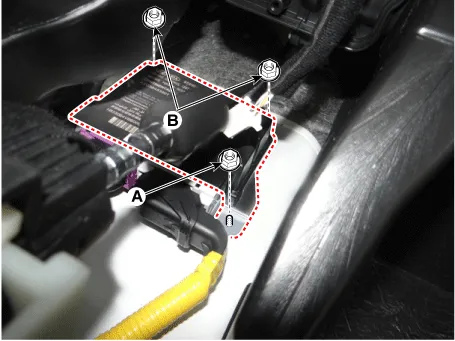 Loosen the bolt (A) and nuts (B) and then remove the Supplemental Restraint System Control Module (SRSCM).