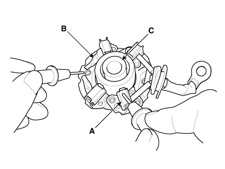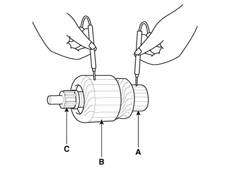 Check with an ohmmeter that no continuity exists between the commutator (A) and armature coil core (B), and between the commutator and armature shaft (C). If continuity exists, replace the armature.