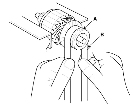 Check the commutator (A) surface. If the surface is dirty or burnt, resurface with emery cloth or a lathe within the following specifications, or recondition with #500 or #600 sandpaper (B).