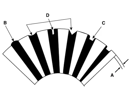 Check the mica depth (A). If the mica is too high (B), undercut the mica with a hacksaw blade to the proper depth. Cut away all the mica (C) between the commutator segments. The undercut should not be too shallow, too narrow, or v-shaped (D).