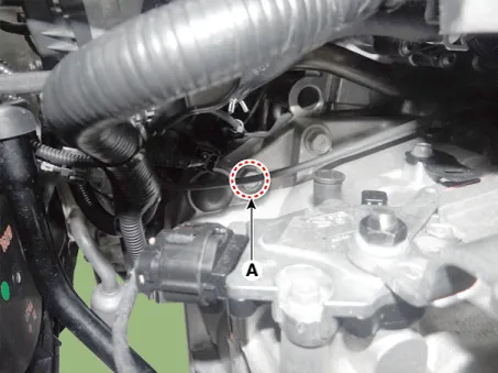 Remove the starter (A) after loosening the mounting lower bolt (B).