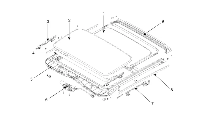 2. Sunroof glass panel assembly 3. Sunroof guide assembly 4. Sunroof deflector assembly 5. Sunroof sub frame assembly |