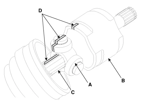 Make alignment marks (D) on spider roller assembly (A), TJ housing (B), and shaft spline (C) to aid reassembly.