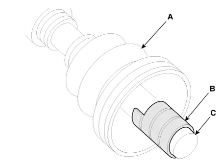 For reusing the boot (A), wrap tape (B) around the driveshaft splines (C) to protect the boot (A).