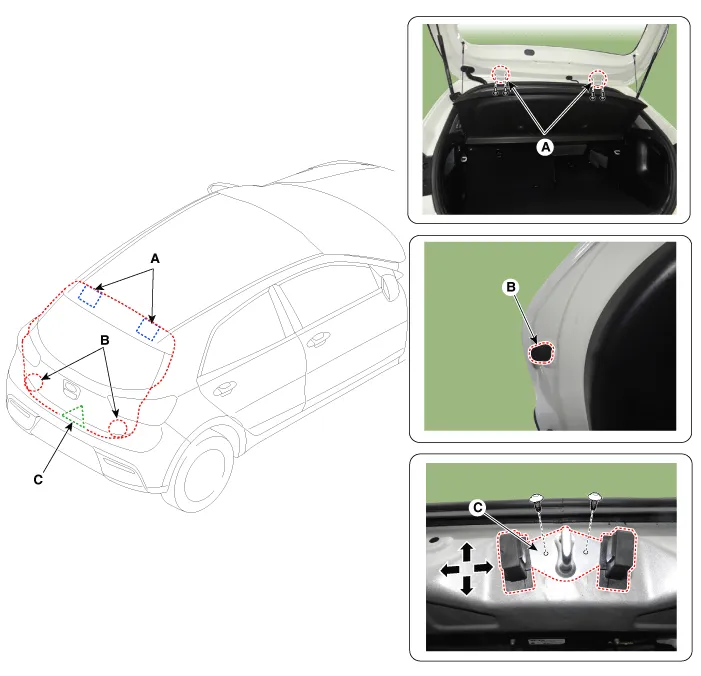 After loosening the tailgate striker (C) mounting bolts, adjust the tailgate striker by moving it up and down, or right and left.