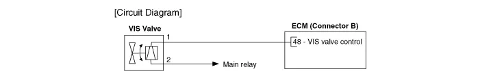 Variable Intake manifold Solenoid (VIS) valve is installed on the intake manifold. The VIS valve controls the vacuum modulator which activates a valve in the intake manifold. The ECM opens or closes this valve according to engine condition (Refer to below table).