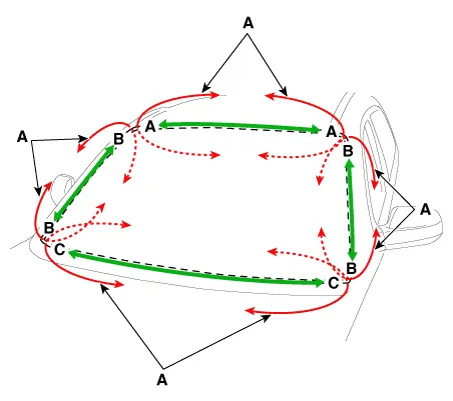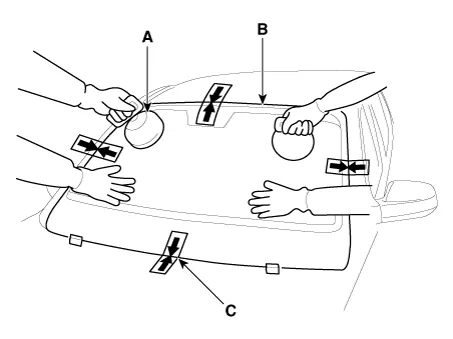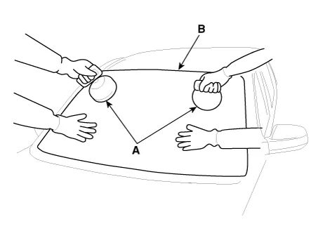 Use suction cups (A) to hold the windshield glass (B) over the opening, align it with the alignment marks (C) made in step 15, and set it down on the adhesive. Lightly push on the windshield until its edges are fully seated on the adhesive all the way around. Do not open or close the doors until the adhesive is dry.