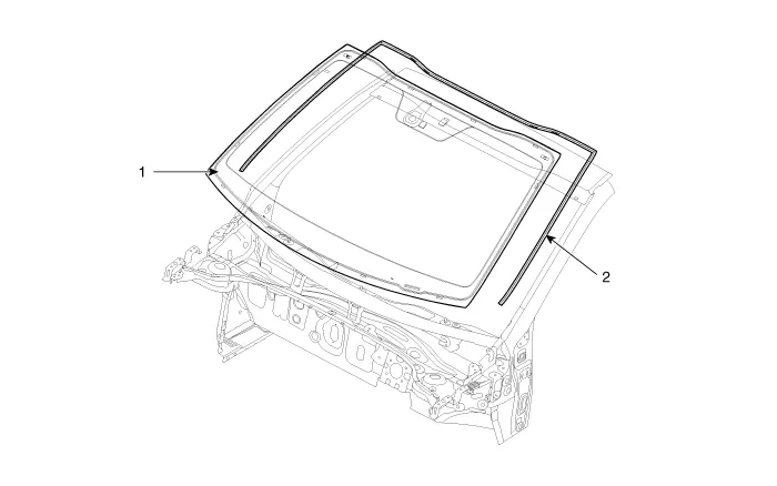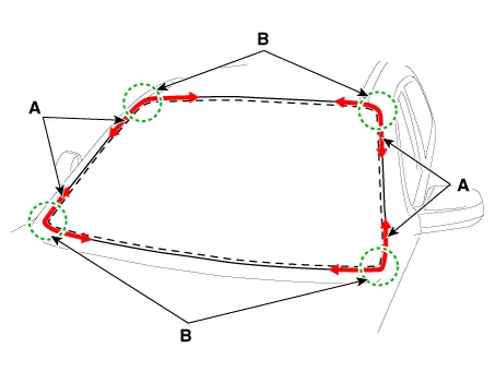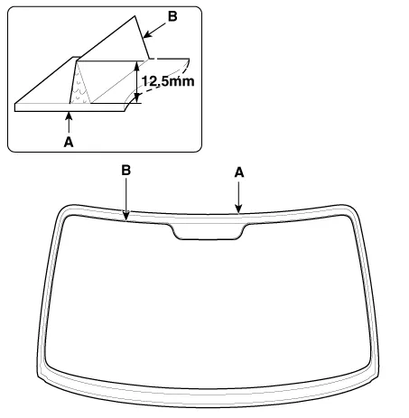 Pack adhesive into the cartridge without air pockets to ensure continuous delivery. Load the cartridge in a caulking gun, and run a bead of adhesive (B) around the edge of the windshield glass (A) between the fastener and molding as shown. Apply the adhesive within 30 minutes after applying the glass primer. Make a slightly thicker bead in each corner.