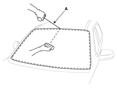 Carefully lift up the windshield glass (B) by using a glass holder (A).