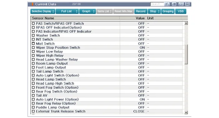In the body electrical system, failure can be quickly diagnosed by using the vehicle diagnostic system (KDS/GDS). The diagnostic system(KDS/GDS) provides the following information.